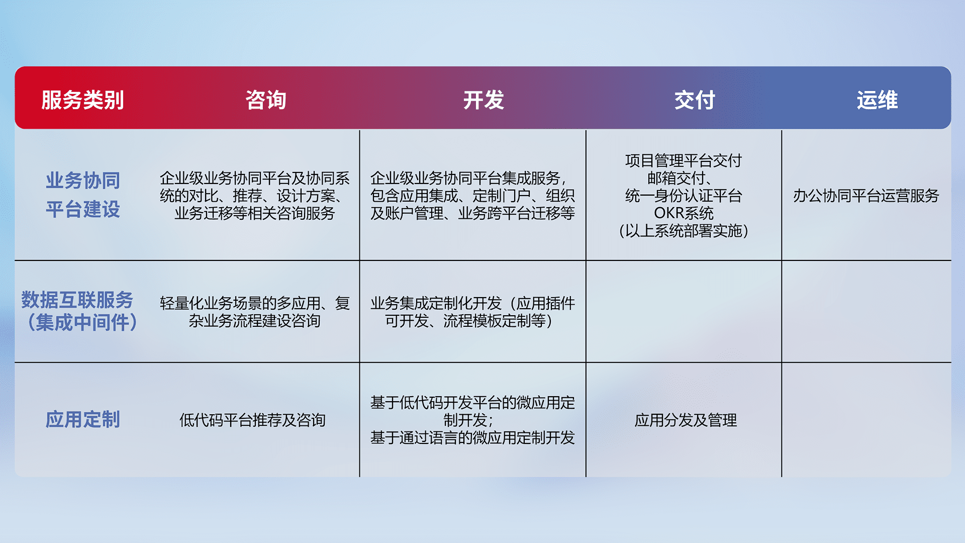 针对钉钉、、、、企微、、IDaas等平台级产品提供产品的规划、、、方案、、、、交付、、定制化开发等服务,,,实现如统一协同办公、、智能客户服务、、混合会议管理、、、、智能数据查询、、、、等业务场景,,,实现数字化转型。。。